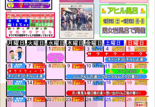 ■イベントカレンダーのご案内 9月のイベント ①アヒル風呂 9月13日(土)~9月15日(日)の3日間は、男女露天岩風呂にて アヒル風呂を実施致します。 たくさんのアヒルに囲まれて、癒しのひと時を体感ください☆ ②回数...